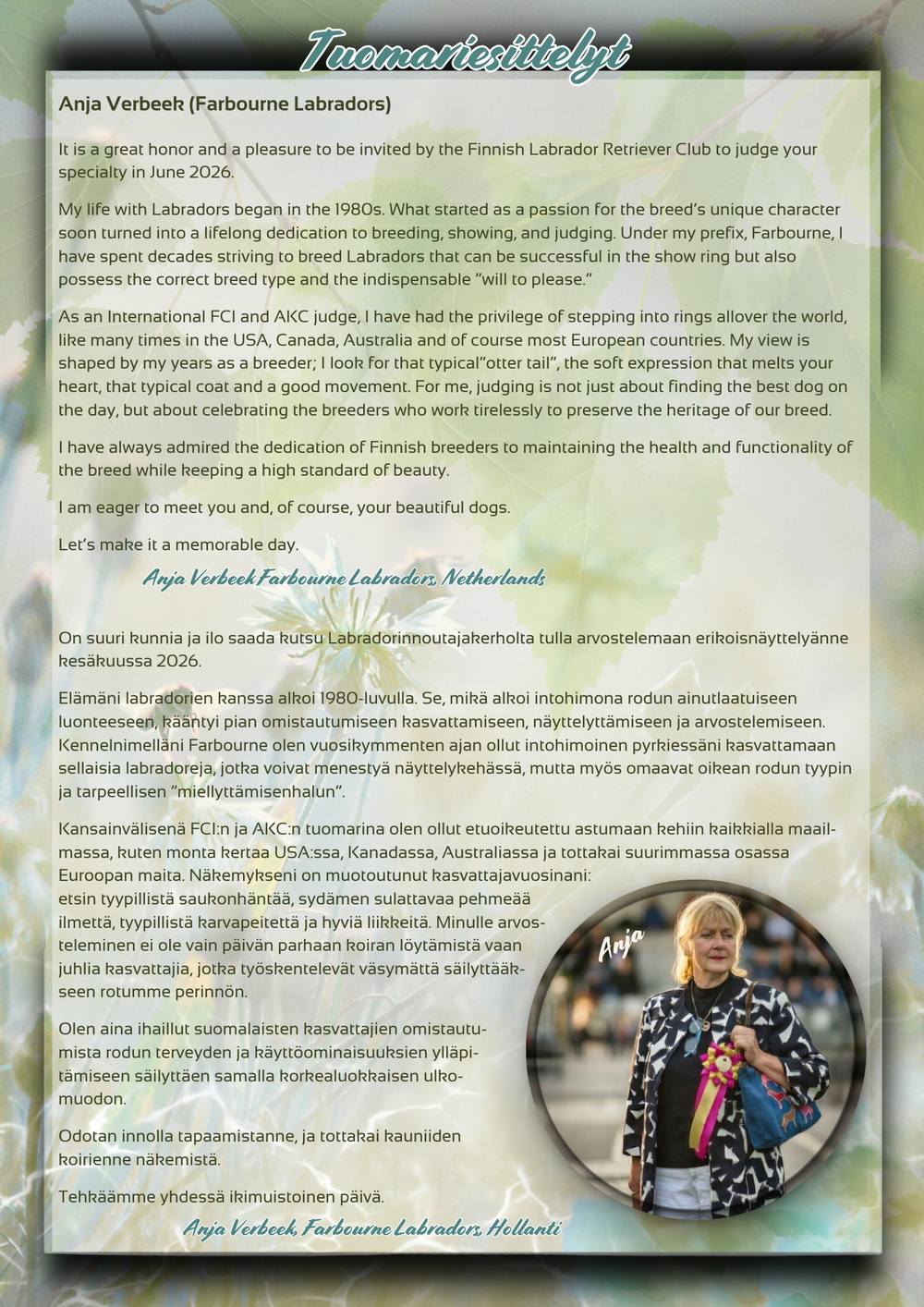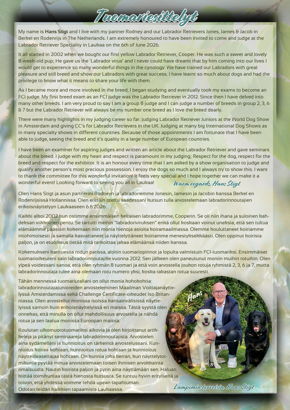 Entry fee 39€, same owner’s 2nd and other dogs 36€. Puppies and veterans 34€, over 10 years old veterans